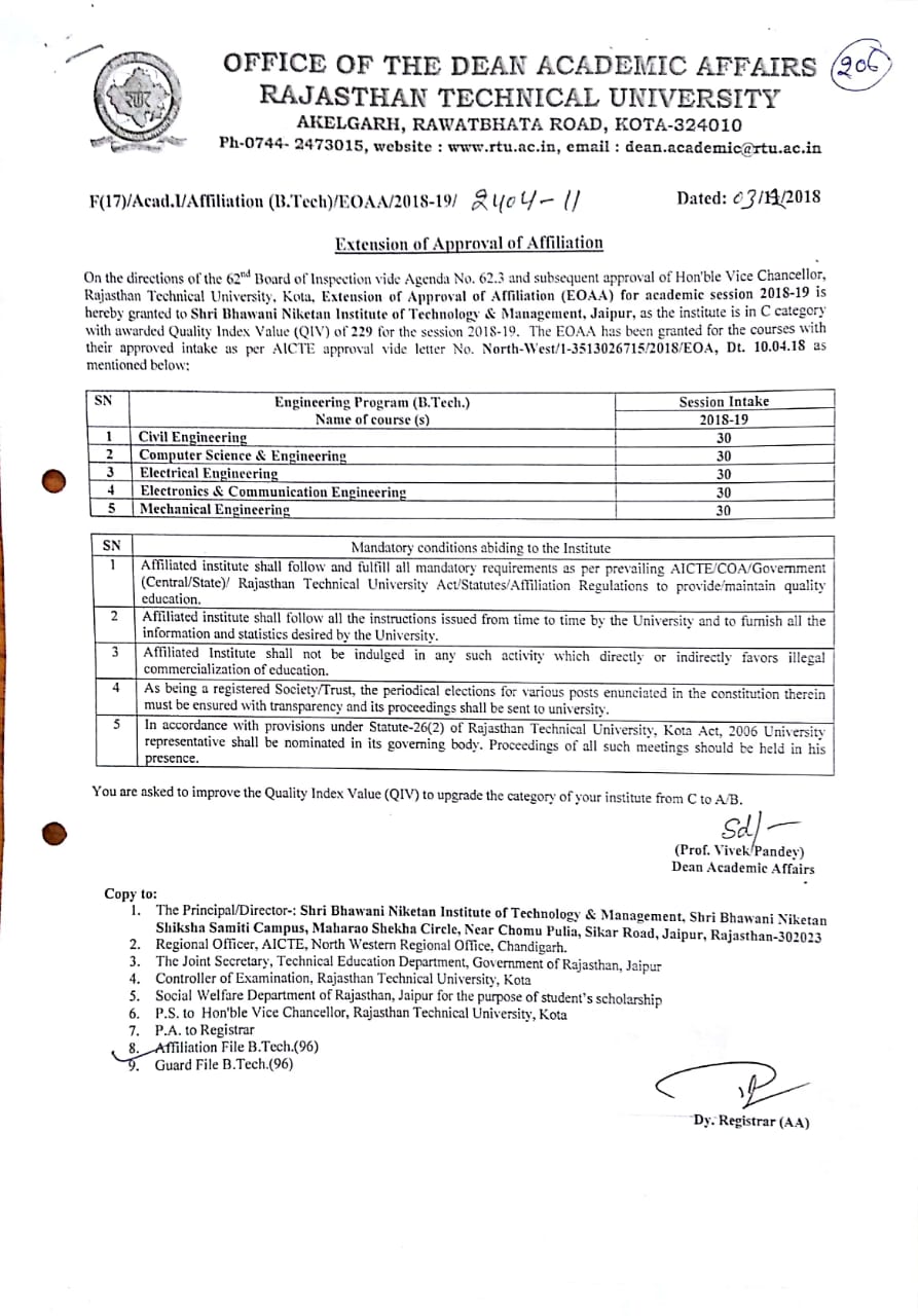 SBNITM is approved by AICTE and Affiliated to RTU, Kota since July 2009. The college is nestled in the 350 acres campus of shri bhawani niketan shiksha samiti, situated in the heart of city with close proximity of Bus stand, Railway station, shopping centres hospitals etc.The campus building is inspired by Rajasthan heritage which makes it very beautiful and alluring.